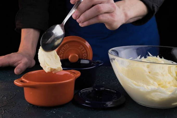 - Hak de knoflook heel fijn. Meng roomkaas, boter en knoflook in een kom.