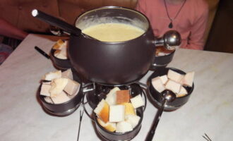 - Als de fondue klaar is, doe je hem in een speciale fondueschaal en verwarm je hem op een alcohollamp. Serveer de fondue met sneetjes brood.