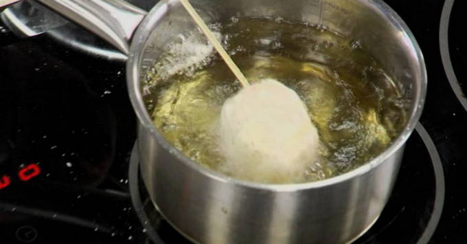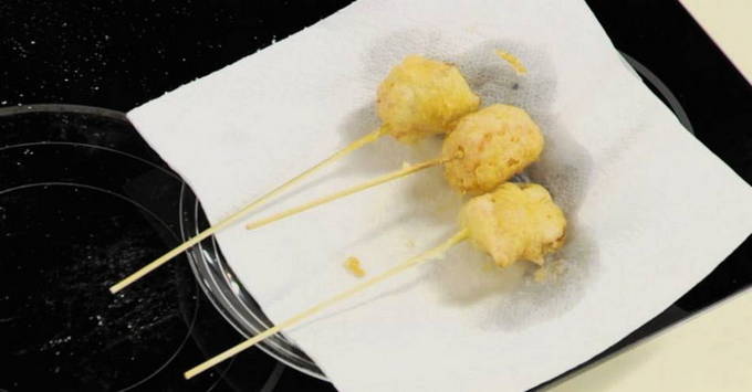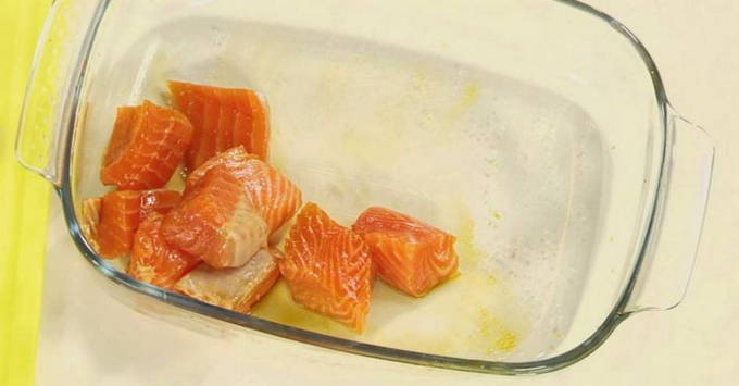 - Verhit een grote hoeveelheid plantaardige olie in een pan. Doop de stukjes zalm in het deeg, doe ze in kokende olie en bak ze gaar.