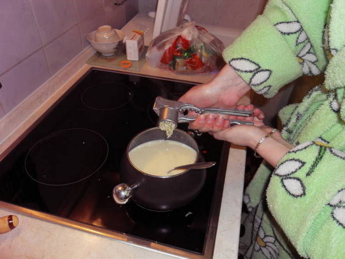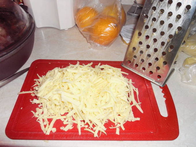 - De kaas moet van hoge kwaliteit zijn, niet gemaakt van plantaardige vetten, anders lost hij gewoon niet op. Rasp de kaas op een grove rasp.
