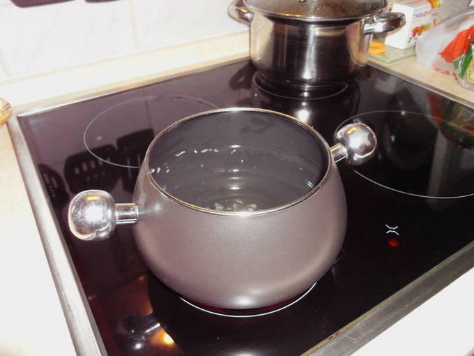 - Giet water in een grote kom, leg een handdoek of een doek op de bodem. Verwarm het water tot 70 graden.