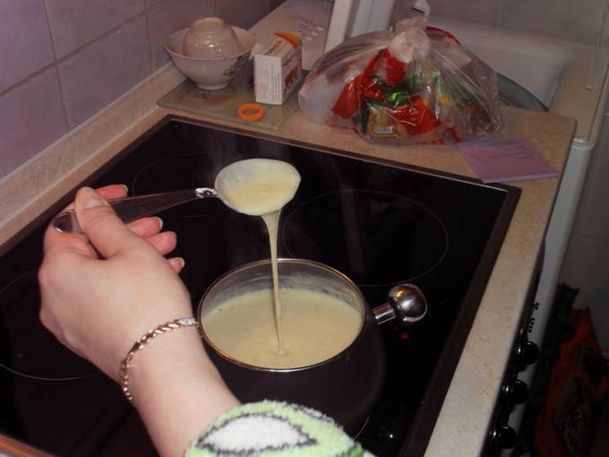 - Haal de pan van het vuur en voeg de room gemengd met de dooier toe aan de wrongel.