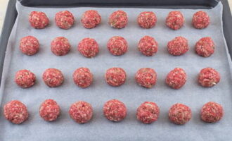 - Wij maken gehaktballen. Om ze dicht en gelijkmatig te maken, neem ze met natte handen of voeg een beetje griesmeel toe aan het gehakt. Een alternatieve optie zou zijn om het gehakt op een koude plaats te "rusten". Leg op een bakplaat, ingevet met plantaardige olie.