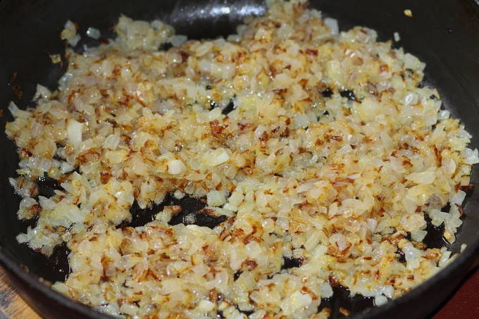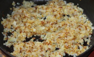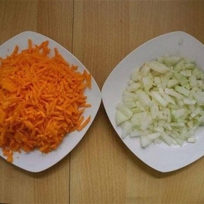 - We verwarmen een koekenpan met plantaardige olie en sturen de uien en wortels daarheen. Bak 3-4 minuten op middelhoog vuur, roer af en toe. Als u klaar bent met frituren, laat u het afkoelen.