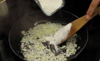 - De saus koken. Haal de schil van de ui, spoel af en snij in blokjes. Met de toevoeging van olie, fruit de uien in een pan. Rasp de wortelen met een grove rasp en voeg ze toe aan de ui. Giet daar bloem, meng en bak nog een paar minuten. Voeg geleidelijk zure room toe, onder voortdurend roeren om klontjes te voorkomen. Breng het mengsel aan de kook.