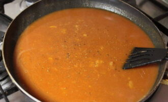 We vullen de bloem en bakken nog een minuut. Voeg vervolgens tomatenpuree toe en bak 4 minuten mee. roeren.