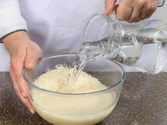 - Laten we beginnen met rijst. Doe het in een kom, vul het met water en spoel het af. Dan doen we het in een schep en koken tot het half gaar is. We laten het water weglopen en zetten het even opzij.