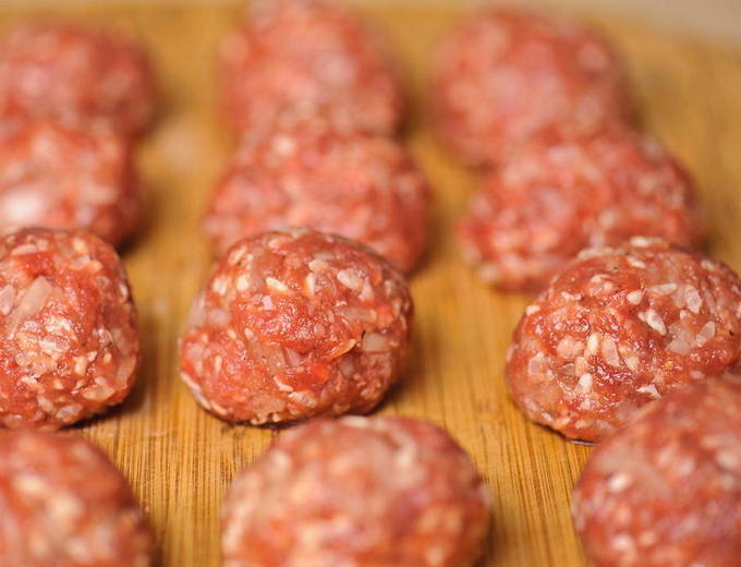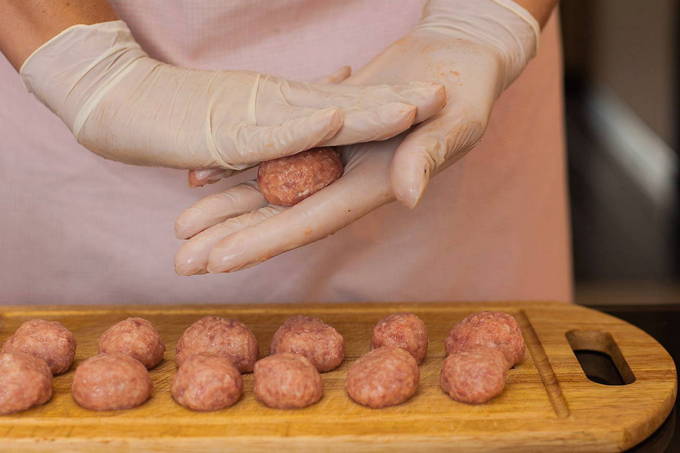 - Vet een ovenschaal (bakplaat) in met plantaardige olie. We boetseren gehaktballen met natte handen en leggen ze in een ingevette vorm.