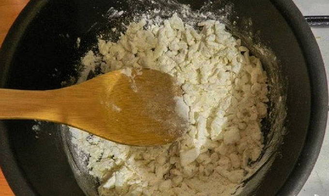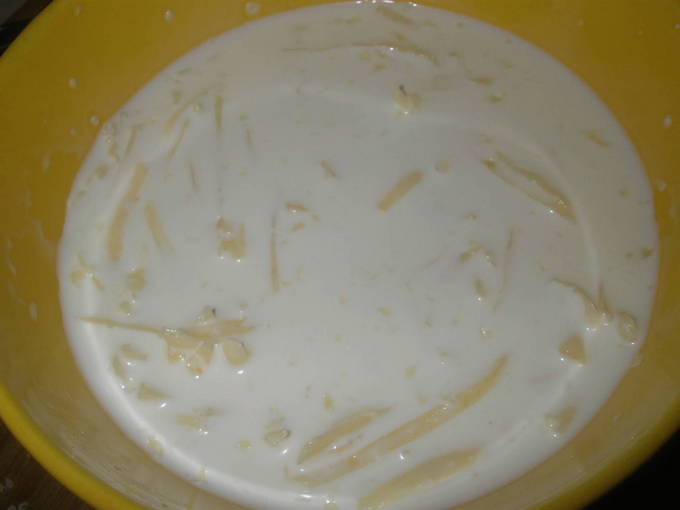 - Wij maken de vulling. Giet de room in een kom en voeg geraspte harde kaas toe. Meng met een vork en vul onze gehaktballen. Bedek de container met folie.