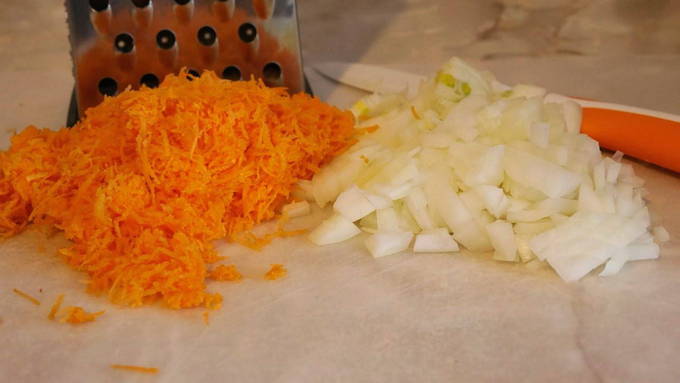 - Schil en snij de ui in blokjes, wrijf de wortelen met een grotere rasp.