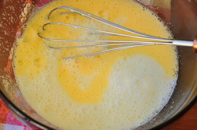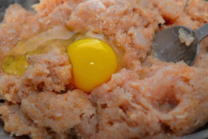 - Klop het ei los met een garde of vork en voeg zout toe. Giet er water in en vervolgens melk, en meng opnieuw goed en schud goed. Laat de vulling even staan en ga verder met de gehaktballen.