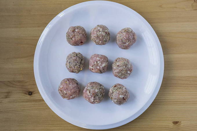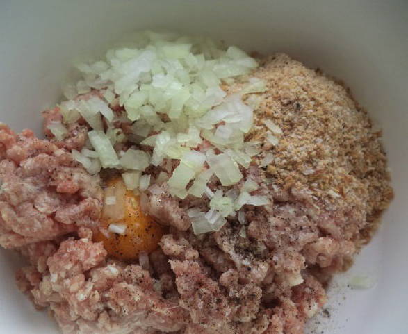 - Drie uien en voeg het toe aan het gehakt, meng goed. Zodat de gehaktballen niet uit elkaar vallen en dichter zijn, rijden we een ei in het gehakt. Vul zout en kruiden in, meng en klop het gehakt, dat wil zeggen, gooi het op de bodem van de kom of op een hard oppervlak (bijvoorbeeld een snijplank). Vorm gehaktballetjes met natte handen en leg ze even opzij.
