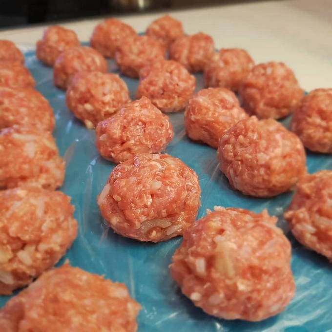 - Combineer in een aparte container het gehakt met het ei en bereid frituren. Voeg rijst toe, evenals peper en zout. Meng alles goed. Wij boetseren gehaktballen met natte handen.