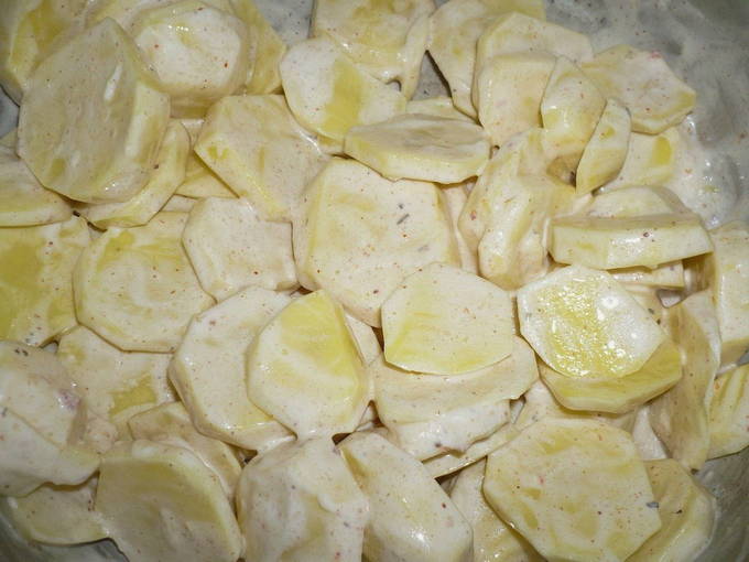 - Was de aardappelen en schil ze, snijd ze in partjes. Voeg zout toe aan de aardappelen. Voeg zure room toe en meng met je handen.