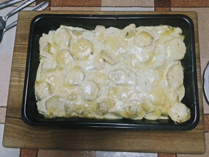 - We bakken in een op 180 graden voorverwarmde oven. Na 15 minuten moet de folie worden verwijderd, maar de vulling moet nog 15 minuten worden gebakken. Dan kun je het gerecht proberen! Eet smakelijk!