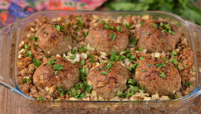 - Vet de ovenschaal in met plantaardige olie. Boekweit, dat tegen die tijd al is gezwollen, verspreiden we op de bodem van de vorm, nadat we het water hebben afgetapt. Vul boekweit met de helft van de vulling en meng. Leg daarna de gehaktballetjes en vul ze met het tweede deel van de vulling. Verwarm de oven voor op 180 graden en stuur het gerecht daar 30-40 minuten. Eet smakelijk!