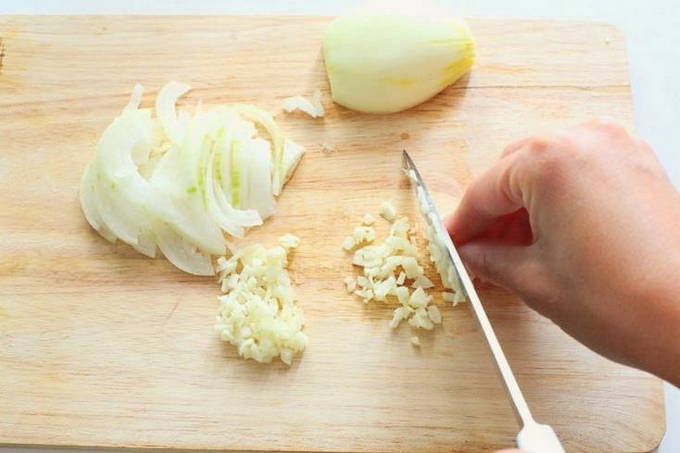 - Pel de ui en knoflook en hak ze fijn in blokjes.