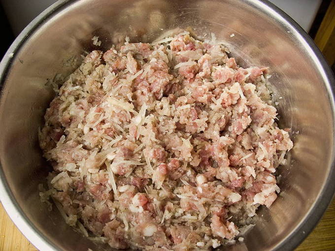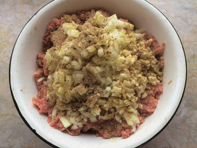 - Doe het gehakt in een aparte kom. Voeg er gesnipperde ui en knoflook aan toe. Voeg kruiden en zout toe. Meng goed en laat een uur staan.