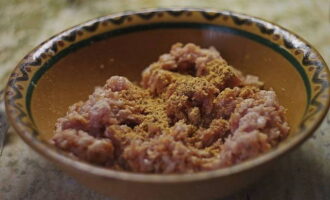 Voeg kruiden toe aan het gehakt en meng goed. Als de smaakmaker zout bevat, hoeft het vlees niet gezouten te worden.