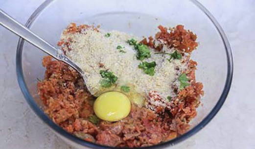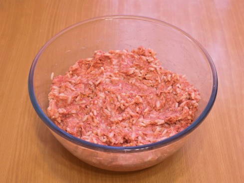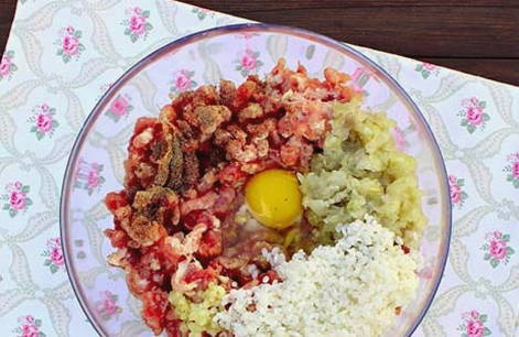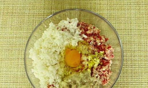 - Doe het gehakt in een kom, voeg gesnipperde ui en knoflook, kippenei, gekookte rijst, gemalen peper en zout toe, meng alles goed.