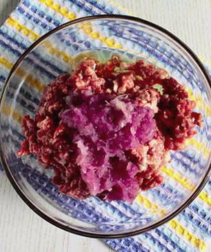 - Pel de uien en wrijf een ui door een vleesmolen. Meng het gehakt, de ui en het kippenei. Zout en kruid het gehakt, meng opnieuw.