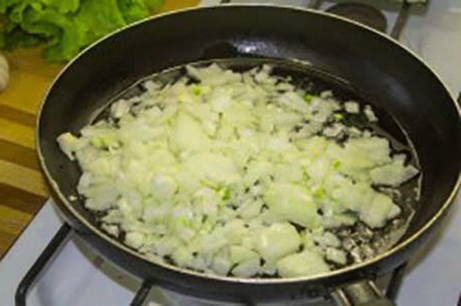 - Hak de uien fijn met een mes. Bak het in plantaardige olie tot het zacht is.