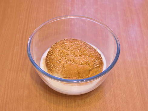 - Week het broodje in melk en pureer het vervolgens met je handen.