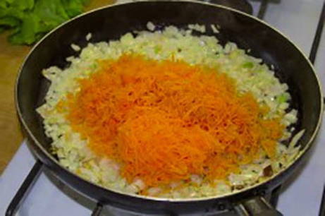 - Rasp de wortelen, voeg toe aan de ui in de pan en bak 4-5 minuten, af en toe roeren.