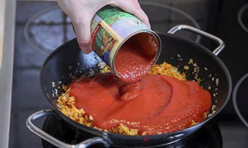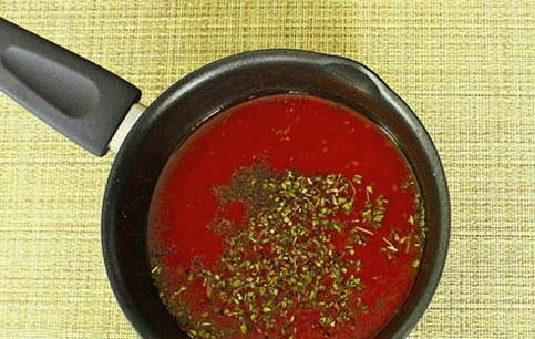 - Breng de tomatenpuree over in een pan met dikke bodem, zet in brand en breng aan de kook. Breng op smaak met zout en droge basilicum.