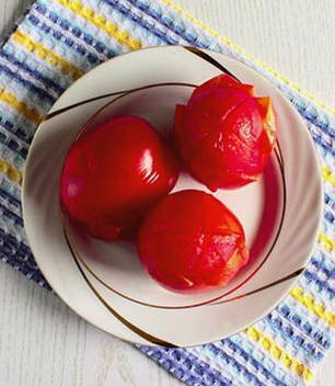 - Was de tomaten, snijd ze in kruisvorm en dompel ze een paar minuten in kokend water. Verwijder vervolgens de huid van de incisie.