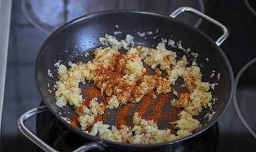 - Doe de teentjes knoflook en uien in een blender, hak de groenten fijn. Passeer de resulterende massa in plantaardige olie en voeg dan paprika en gemalen komijn toe.