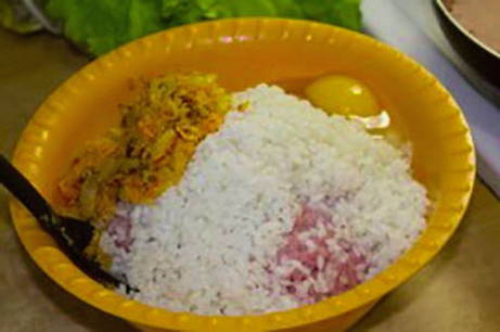 - Spoel de rijst meerdere keren af en kook tot hij gaar is. Meng in een kom het gehakt, de gesnipperde ui, knoflook, gekookte rijst, kippenei, zout en gemalen peper.