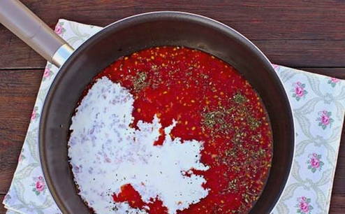 - Maak een romige tomatensaus. Doe de geraspte tomaten in een pan, giet de room erbij, voeg zout, gemalen peper en basilicum toe. Giet vervolgens kokend water in, roer.