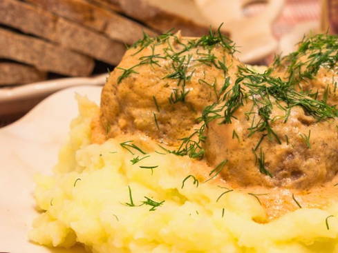 Gehaktballetjes in tomaten-zure roomsaus zijn mals en sappig. Als ideaal bijgerecht zijn gekookte aardappelen of boekweitpap geschikt.