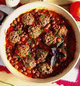- Voeg tot slot gehakte kruiden toe en haal van het vuur. Serveer warme gehaktballen met bonen in tomatensaus.