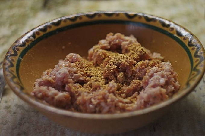 Voeg kruiden toe aan het gehakt en meng goed. Als de smaakmaker zout bevat, hoeft het vlees niet gezouten te worden.