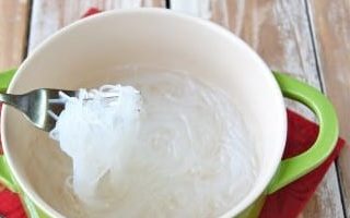 - Wij bereiden funchose noedels volgens het recept op de verpakking. Kook water en giet de noedels erin, laat 5 minuten zacht worden. (overdrijf het niet!), Nu zullen we het water door een vergiet laten lopen en de noedels met koud water besprenkelen.