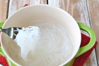 - Vul de funchose noedels met kokend water, laat 7 minuten trekken. Giet de noedels af en spoel ze af met koud water.