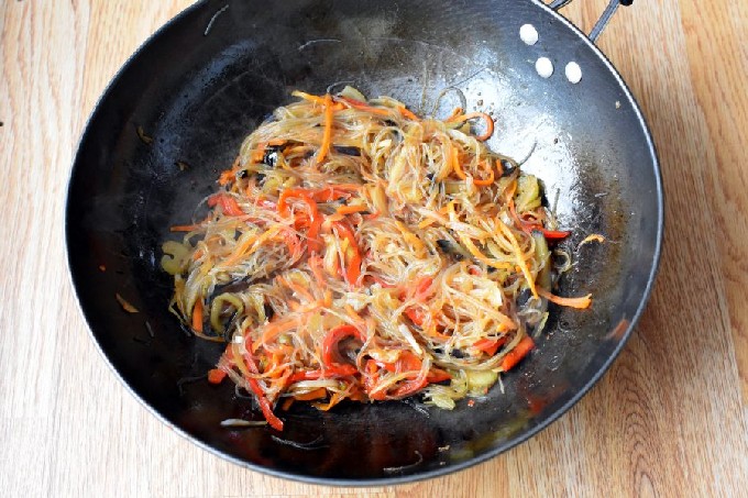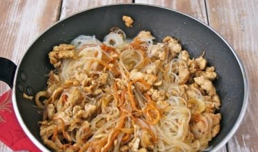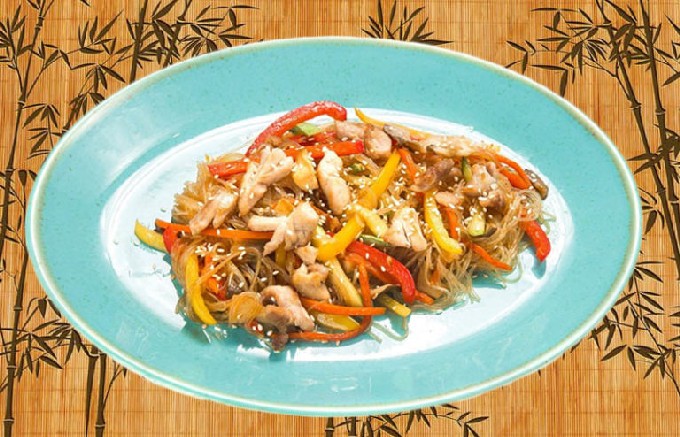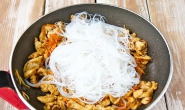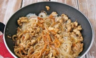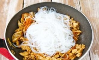 - Voeg de noedels toe aan de kip, meng. Bak een paar minuten, zet dan het vuur uit en laat 5 minuten staan, zodat de funchose in de saus is gedrenkt.