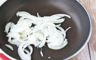 Pel de ui en snijd hem in halve ringen. In een koekenpan in plantaardige olie, bak de ui aan alle kanten, tot ze zacht zijn. Het is beter om medium vuur te kiezen.