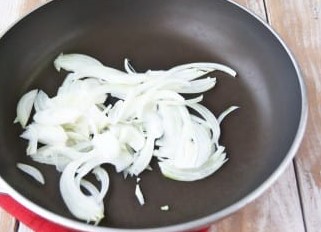 - We verwijderen de schil van de ui, snijden deze in kleine halve ringen en bakken in plantaardige olie.