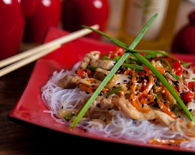 - Funchoza met kip, groenten en sesamzaadjes