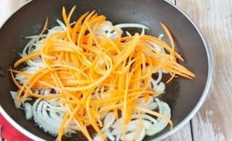 - Pel de ui. Nu schillen we de wortelen. Meng ze en bak ze zacht in plantaardige olie.