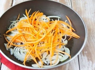 - We wrijven de wortels op een grove rasp, snijden de paprika in dunne reepjes en bakken de groenten in een pan.