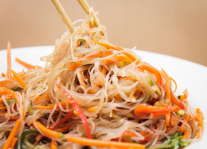 Funchoza met kip, groenten en bonen is een heerlijke salade gemaakt naar traditioneel Koreaans recept. Funchozu wordt ook wel glasnoedels genoemd vanwege het uiterlijk en de bijzondere eigenschappen. Ze absorbeert perfect de sappen van andere producten en de geur van kruiden.Met deze sappige, smaakvolle salade schittert je menu met nieuwe kleuren.