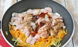 - Verwarm een koekenpan voor, vet deze in met olie. We verspreiden de stukjes kip en brengen op smaak met kruiden: voeg kerrie, peper en zout toe.