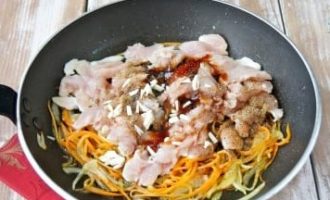- We mengen alle kant-en-klare ingrediënten voor onze salade: uien en wortelen, knoflook met paprika, noedels en stukjes gerookte kip.