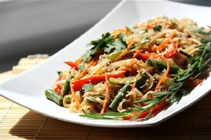 - Voeg de noedels toe aan het afgewerkte frituren. Leg alles op een bord en breng op smaak met sojasaus. We staan erop dat de salade ongeveer een uur op een koude plaats wordt bewaard.