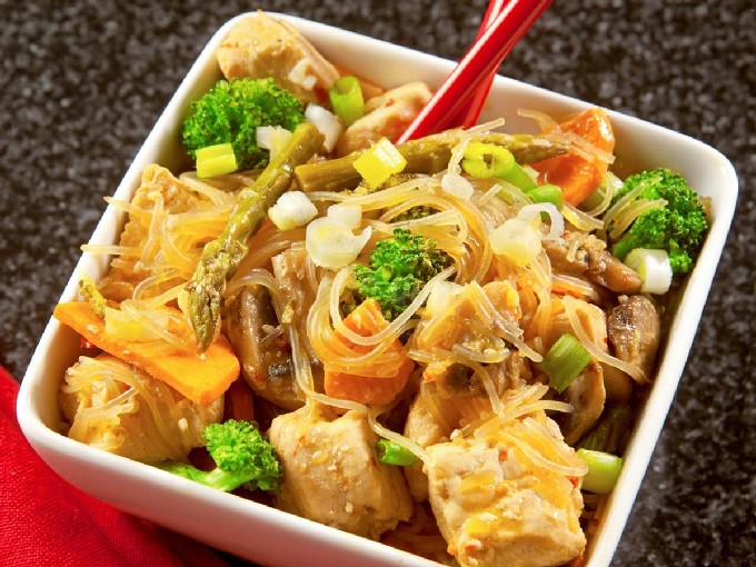 Heerlijke funchose met kip, groenten en champignons