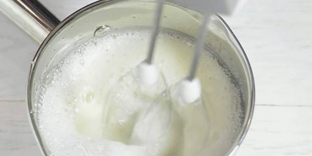Klop het eiwit met een mixer tot een donzig wit schuim ontstaat.